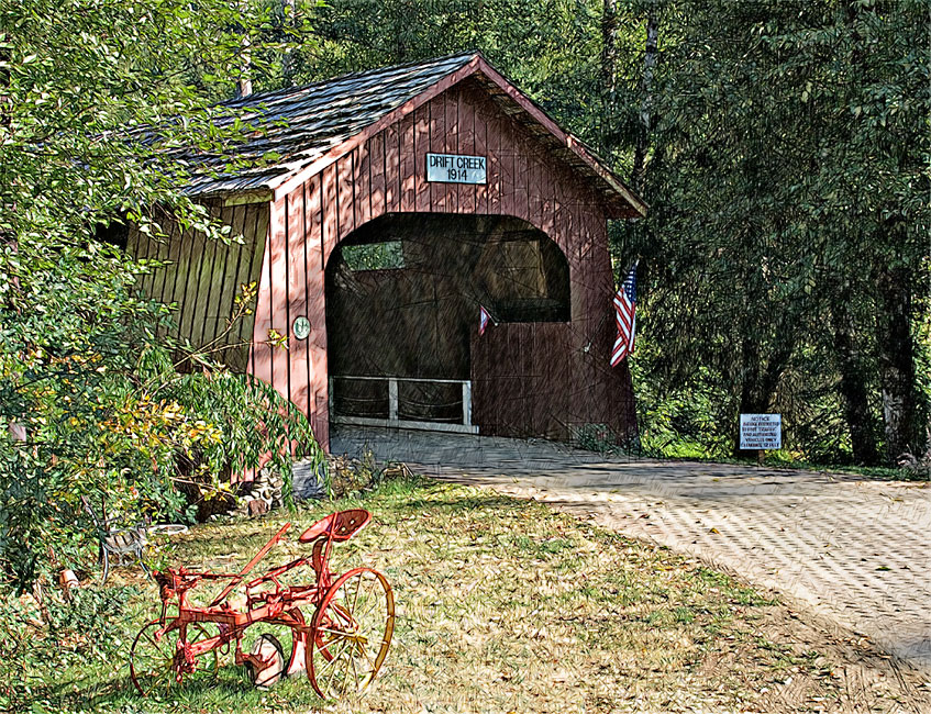 The Driftcreek Covered Bridge crosses Bear Creek east of Lincoln City Oregon. Built in 1914, the structure originally crossed Drift Creek which flows into Siletz Bay of the Pacific Ocean south of Lincoln City. This is our painterly sketch.