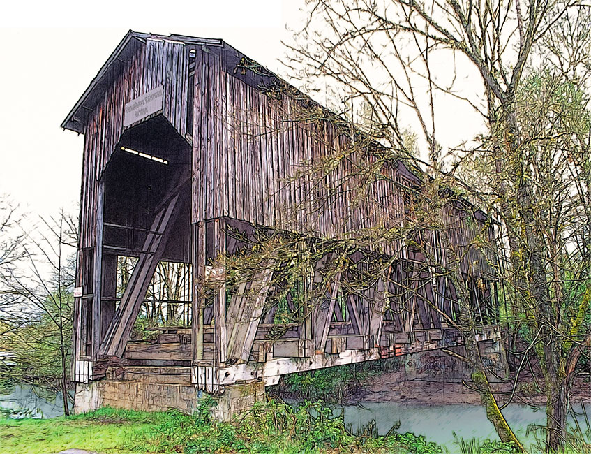 The bridge was constructed in 1925 by lumberman J.H. Chambers to transport logs across the Coast Fork Willamette River to his sawmill on the east side of the bridge. It was used from 1925 to 1951. This picture and painterly sketch was taken in 1996. Restoration of the Chambers Covered Railroad Bridge was completed in November 2011.
