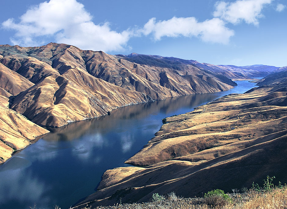 A relaxing view of the reservoir behind Brownlee Dam between Idaho and Oregon on the Snake River, surrounded by dry hills.